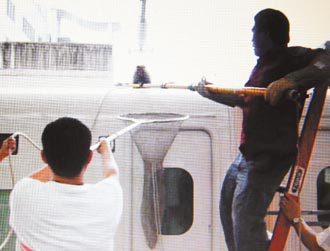 這只獼猴大鬧三小時后,圍捕人員射出四支麻醉箭,獼猴中箭跌落高鐵車廂上。(圖片來源:臺灣《聯(lián)合報》)