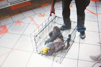 高雄市消防局表示,昨天上午九時九分,左營站員工發(fā)現(xiàn)第三站臺內(nèi)側(cè)梁柱上有只獼猴亂竄,立即出動多人,攜帶捕獸夾、捕獸網(wǎng)及鐵籠趕往。獼猴非常機警,見一群人“來意非善”,在站臺梁柱間跳來蕩去,再由站臺外側(cè)往大廳梁柱移動,把后面“始終慢一步”的圍捕人員急得團團轉(zhuǎn)。 圍捕人員力斗不過想智取,拿出香蕉誘捕,獼猴跳下來撿起香蕉大口吃,但圍捕人員靠近,獼猴立即跳上梁柱,亂得他們只好干瞪眼。