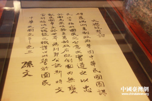 孫中山手書“中華民國第一任臨時大總統”誓詞。(中國臺灣網 宿靜 攝)