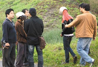 劉姓少年(左戴安全帽者)、林姓少年(右戴安全帽者)因缺錢,本月15日涉嫌殺害鄭姓出租車駕駛,圖為兩人到現場模擬。(圖片來源:臺灣《聯合報》)