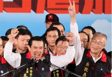 馬英九與副手吳敦義上臺(tái)并高舉雙手發(fā)表談話。他表示,“恭喜大家,我們贏了”!。▓D片來(lái)源:臺(tái)灣《中時(shí)電子報(bào)》)