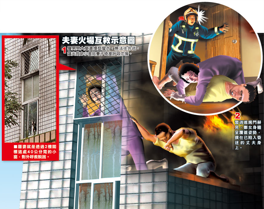 消防員表示,當時見鄭女呼救,因事態(tài)緊急,除先將鄭女下方窗戶擊破,讓屋內部分濃煙排出,再施以水霧防護,增加空氣中氧氣并降溫,讓鄭女有足夠空氣呼吸。同時間另一隊人馬則破門進入鄭女住宅,15分鐘便將火勢控制,但屋內仍濃煙密布,警消清查驚覺屋內還有個50公分寬的小樓梯,攀上樓聽見鄭女微弱求救聲,打開房門赫見,鄭女身體呈覆蓋姿勢、撲在已陷入昏迷的丈夫身上,她痛哭失聲頻呼:“快來救他!”消防隊員要求:“你還能走,快離開!”但鄭女卻說:“不要!我要等我先生啦!先救救我先生再說,好不好?”
