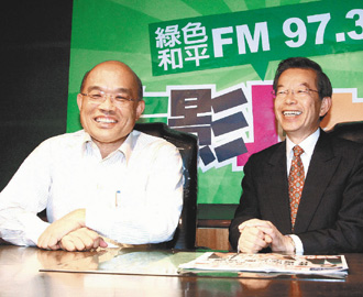 主持電臺節(jié)目的長謝長廷(右),昨天邀參選民進(jìn)黨主席的蘇貞昌(左)接受訪問,兩人互動和樂。(圖片來源:臺灣《聯(lián)合報》)