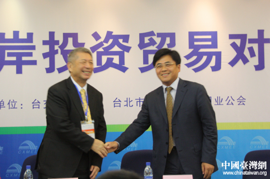 臺交會組委會副主任、廈門市副市長張燦民與臺北市進出口商業同業公會理事長劉國昭共同出席對接會。(中國臺灣網 王思羽 攝)