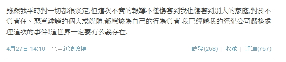 躺著還中槍的藍正龍,這回也沒有選擇沉默下去,27日下午他透過微博痛斥報道不實,藍正龍表示:“雖然我平時對一切都很淡定,但這次不實的報導不僅傷害到我,也傷害到別人的家庭....我已經(jīng)請我的經(jīng)紀公司嚴格處理這次的事件!這世界一定要有公義存在”。媒體消息,藍正龍經(jīng)紀人業(yè)已響應,請托公司對胡亂爆料的媒體采取法律行動。(中國臺灣網(wǎng) 李帥)