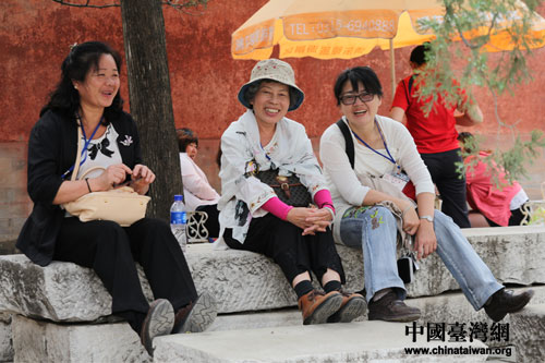 臺(tái)灣基層民眾游覽清東陵。圖為團(tuán)員們?cè)谇鍠|陵石凳上休憩。(中國(guó)臺(tái)灣網(wǎng)發(fā) 張成標(biāo) 攝)