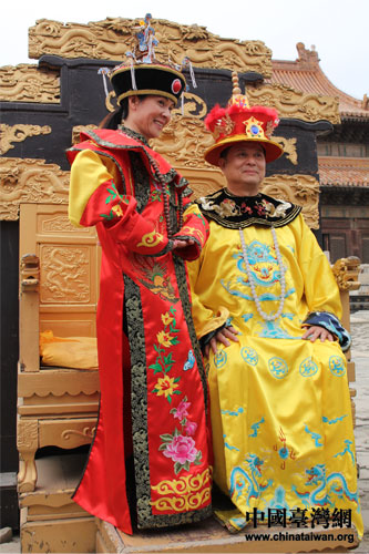 臺灣基層民眾游覽清東陵。圖為來自云林縣的一對夫妻戲“穿”回古代,精彩演繹著古代帝王帝后的別樣風情。(中國臺灣網發 張成標 攝)
