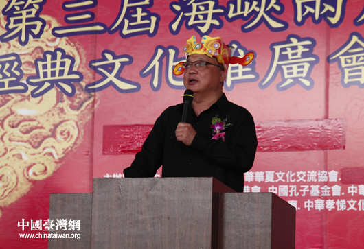 濟(jì)南市教育學(xué)會參訪團(tuán)團(tuán)長鄒衛(wèi)平在第三屆海峽兩岸經(jīng)典文化推廣會演致辭(中國臺灣網(wǎng) 邢同林 攝)