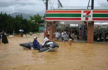 中國臺灣網6月12日消息 據臺灣媒體報道,今天臺灣籠罩在暴雨狀態中,就有民眾干脆騎乘游泳用“鯨魚”汽船,在街上“游”進便利超商,成為淹水中苦中作樂一景。