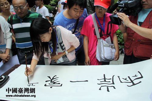 7月4日下午,參加第三屆“臺(tái)灣學(xué)生天府夏令營”活動(dòng)的105名師生與成都七中的學(xué)生們一道漫步杜甫草堂,聽取巴蜀文化講座,共同吟誦“詩圣”杜甫的名篇佳作,感受中華文化源遠(yuǎn)流長。 圖為來自臺(tái)灣云林縣的林芷伃小朋友用毛筆書寫“兩岸一家親”。