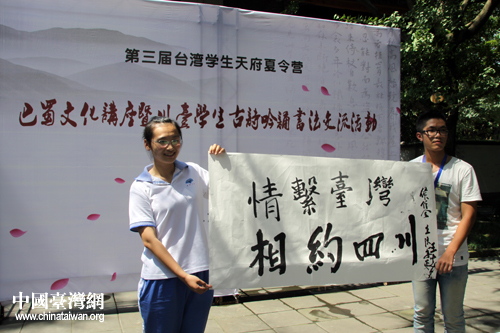 7月4日下午,參加第三屆“臺(tái)灣學(xué)生天府夏令營”活動(dòng)的105名師生與成都七中的學(xué)生們一道漫步杜甫草堂,聽取巴蜀文化講座,共同吟誦“詩圣”杜甫的名篇佳作,感受中華文化源遠(yuǎn)流長。 圖為兩岸學(xué)生合作書寫本次夏令營主題“情系臺(tái)灣·相約四川”。