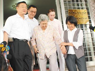 陳水扁的母親陳李慎(前排中)由女兒陳秀琴(右一)攙扶,在民代高志鵬(左二)、臺北市議員江志銘(左一)的陪同下探視陳水扁。
