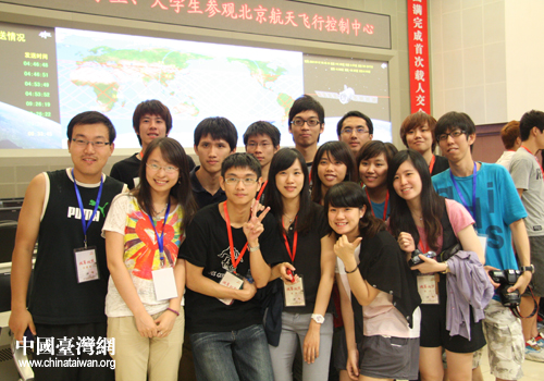 學(xué)生們在北京航天飛行控制中心參觀合影留念。(中國臺(tái)灣網(wǎng) 李瑞艷 攝)