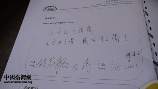 臺灣中山大學醫(yī)學系的林家揚在宋慶齡故居文物館留言。(中國臺灣網(wǎng) 李丹 攝)