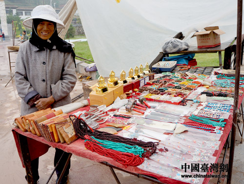 當?shù)鼐用裨谒査麻T口銷售西藏風格小飾品 (中國臺灣網(wǎng) 羅旭婷 攝)