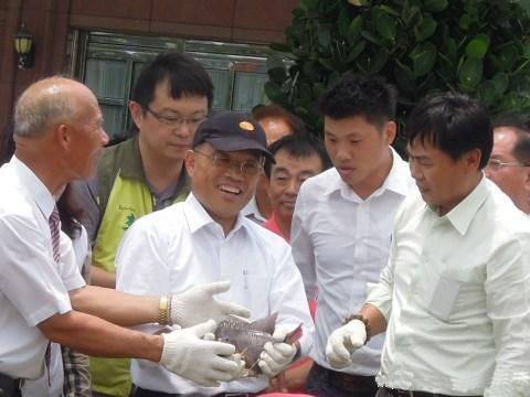 工作人員從網(wǎng)里抓鯛魚拿給前來參觀的貴賓拍照留念,蘇貞昌帶著白色棉布手套接下一尾魚,但魚扭來扭去抓不穩(wěn),旁邊的工作人員還出手幫忙。蘇貞昌試圖把魚立起來讓媒體拍照,雙手突然抽搐了一下,馬上把魚放入池中。原來他的手被魚鰭刺傷了,而且鮮血直流。