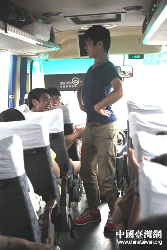 前往蘇州的路上,來自臺北教育大學(xué)的陳昱達在車上表演舞蹈。(中國臺灣網(wǎng) 孟雅詩 攝)