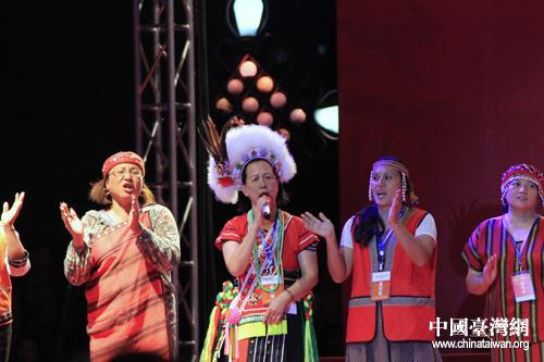 恩施市山民歌匯25日晚間上演,圖為臺灣少數民族代表登臺表演。(中國臺灣網 楊麗 攝)