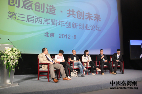 主持人與5名兩岸青年創(chuàng)業(yè)家在論壇現(xiàn)場探討創(chuàng)業(yè)環(huán)境與機遇。(中國臺灣網(wǎng) 黃艷艷 攝)