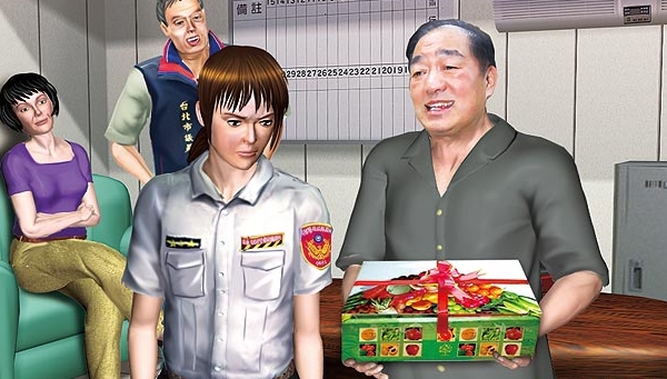 2.基隆市長張通榮與議員沈義傳趕到分駐所,以廖女是精神病患為由,要女警原諒她,并送上水果禮盒。