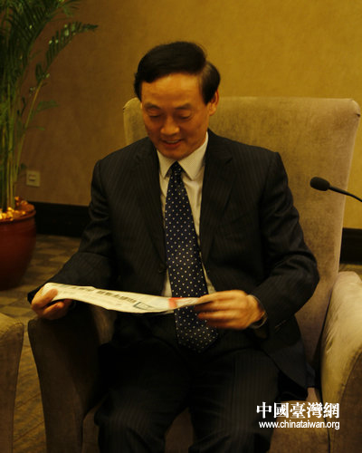農(nóng)業(yè)部副部長(zhǎng)余欣榮會(huì)仔細(xì)閱讀嘉義市農(nóng)會(huì)總干事蕭淑麗帶來(lái)的島內(nèi)宣傳資料。(中國(guó)臺(tái)灣網(wǎng) 郭瑩瑩 攝)