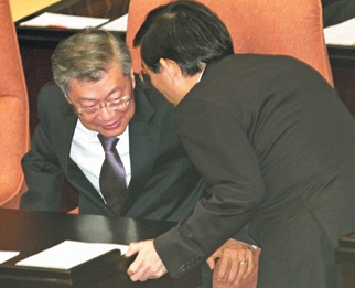 針對疾管局副局長施文儀在網絡發表意見,陳沖(左)昨天表示已請臺當局人事主管部門負責人黃富源(右)調查是否違反公務員服務條例。圖為黃富源在向陳沖報告。圖片來源:臺灣《聯合報》