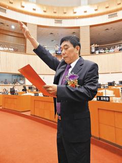 屏東縣議長黃國安一個月來當選2次,昨天上午終于宣誓就職。(圖片來源:臺灣《聯合報》)
