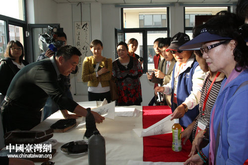 臺灣參訪團(tuán)成員在學(xué)習(xí)年畫繪制。(中國臺灣網(wǎng) 郭瑩瑩 攝)