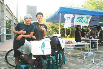 情侶檔魯睿寧(左)、郭嘉吟騎單車環島旅行,昨天在嘉義市創意市集,分享生命故事。圖片來源:臺灣《聯合報》