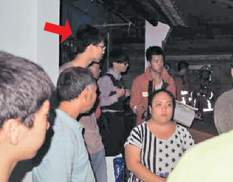 臺灣清華大學吳姓研究生(箭頭指處)縱火后,也留在現場觀看。圖片來源:臺灣《聯合報》