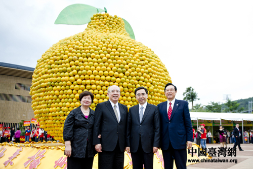 首屆客家文化藝術(shù)節(jié)開幕式后,朱小丹、吳伯雄、陳云林及吳伯雄夫人在客商產(chǎn)品展銷會(huì)合影(中國臺(tái)灣網(wǎng)發(fā) 高訊 攝)