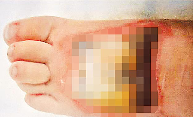 原本白胖可愛的男嬰,因點滴漏針引發左腳潰爛,現在仍在住院治療。圖片來自臺媒