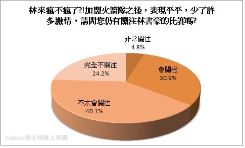 調查結果顯示,非常關注4.8%和會關注30.9%,兩者合計35.7%,雖不在少數,但還是低于不太會關注40.1%和完全不關注24.2%合計的64.3%。相較在2012年初林書豪表現高檔時,電視媒體每天放送最新消息,甚至還有專題報道,而現在只有在有比賽時顯示比分數和最新戰況。相較于年初做的調查,當時有近半數(46.5%)的民眾會因為林書豪而增加對NBA的關注,民眾對林書豪的熱度似乎也略微下滑。