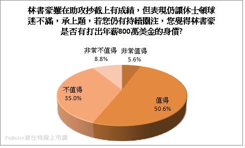林書豪不只是臺灣在關注,在休斯頓也有成千上萬的眼睛在看著他每場的表現。年薪百萬美金的林書豪,有50.6%的民眾認為他值這個價錢,非常值得占5.6%,反之不值得和非常不值得合計有43.8%。以值得就過半數來看,民眾對林書豪還是很有信心的。
