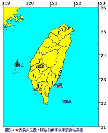 臺東縣綠島和屏東縣三地門震感最明顯,震度皆為2級。臺東市、屏東市、臺南市新化、嘉義市、高雄市、彰化市和斗六市震度則為1級。(中國臺灣網 李帥)