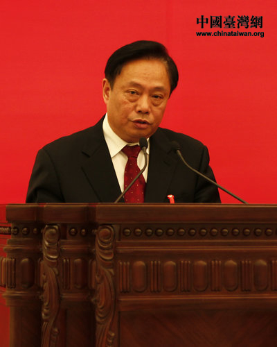 中華全國臺灣同胞聯(lián)誼會會長梁國揚代表全國臺聯(lián)第八屆理事會作工作報告。(中國臺灣網(wǎng) 郭瑩瑩 攝)