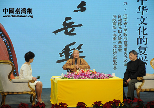 星云大師與海南省文化名人韓少功對(duì)話“幸福生活與中華文化復(fù)興”。(中國臺(tái)灣網(wǎng) 馬萌攝)