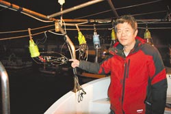 “全家福號”船長游明川看著被日本海上保安廳艦艇沖壞的照明燈,非常無奈。圖自臺灣《中國時報》