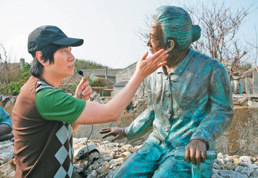 潘安邦2008年觸景傷情,輕撫外婆雕像臉頰。 圖片來自《聯合報》