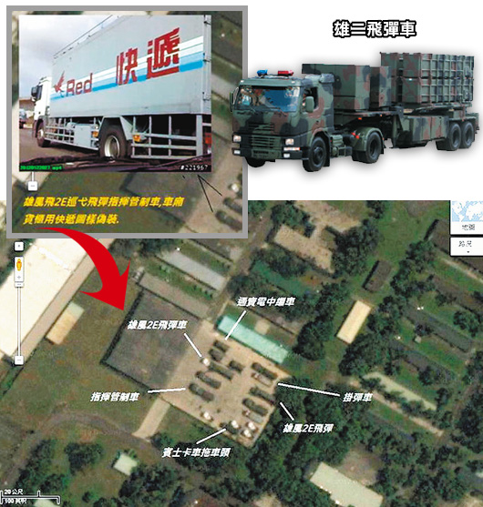 臺導彈基地被軍事迷分別辨識,注明通資電中繼車、掛彈車、雄風二E導彈、卡車拖車頭、指揮管制車、雄二E導彈車(12點鐘方向順時鐘起)。(圖片來自臺媒)