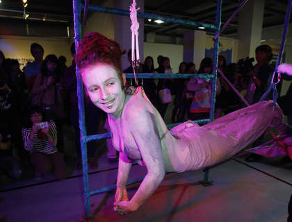 Alice Newstead表演背部肌肉被兩支鐵鉤穿過后懸空吊起。圖片來自臺灣媒體