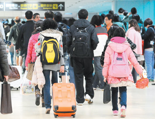 春節(jié)期間有大批陸客赴臺觀光。根據(jù)統(tǒng)計,今年春節(jié),赴臺陸客約5.5萬人,為臺灣帶去約35億元新臺幣旅游收入。圖為臺灣桃園機(jī)場涌動的人潮。(圖片來源:臺灣《聯(lián)合報》)