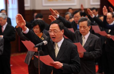 馬英九18日在辦公室主持“行政院”政務(wù)人員宣誓就職典禮,新任“行政院長”江宜樺率全體眾人完成宣誓儀式。(圖片來自臺媒)