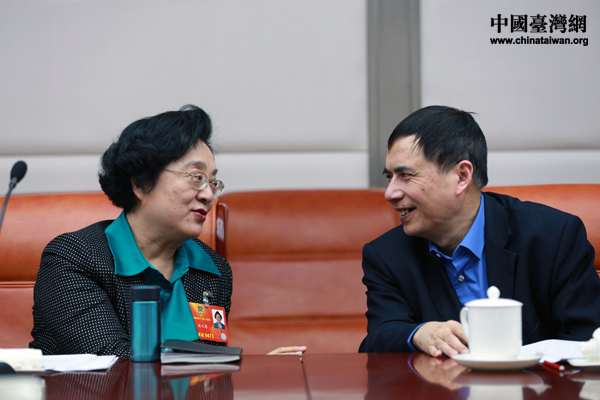 全國(guó)政協(xié)副主席、臺(tái)盟中央主席林文漪在討論會(huì)上與臺(tái)籍委員楊健交流看法。(中國(guó)臺(tái)灣網(wǎng) 于斯文 攝)
