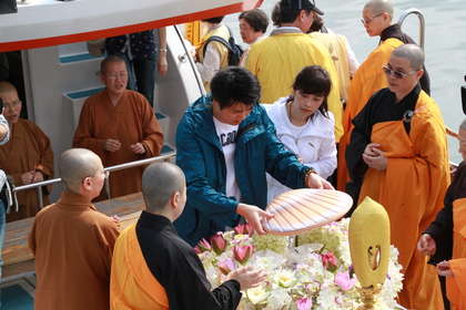 今天上午遺孀王芝祥及26歲的獨子潘惟智,依照潘安邦的生前遺愿,跨海來到已20年沒有踏上的潘安邦澎湖故居細(xì)細(xì)懷念后,將他的部分骨灰放入紙制的貝殼容器內(nèi),再放在蘭花編織成蓮花座造型的載具,在海天佛剎法師誦經(jīng)祝禱下,包船出海將他的骨灰海葬于西嶼內(nèi)埯外海,永眠外婆的澎湖灣。(中國臺灣網(wǎng) 王文英)