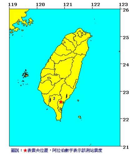 中國臺灣網3月20日消息 據臺灣媒體報道,臺東縣金峰鄉今天下午2時05分發生里氏3.9級地震,震源深度14.2公里。其中,最大震度4級,出現在臺東太麻里,此外,屏東縣三地門震度有2級,屏東市有1級。(中國臺灣網 李帥)