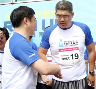 臺北市長郝龍斌(左)上午帶領經(jīng)發(fā)會副召集人連勝文(右)等市政府局處首長代表,參加2013臺北101國際登高賽,賽后兩人握手致意。圖片來自臺灣《聯(lián)合報》