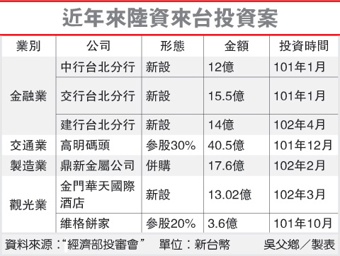張銘斌也分析,除了“新設”的形態(tài)外,去年第4季以來,陸資以“參股”或“并購”型態(tài)的投資案也越來越多。隨著兩岸的相互了解,相關個案會逐漸增加;預料,制造業(yè)或以食品、飲料為主,服務業(yè)還是以金融為大宗。