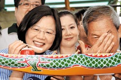 前民進(jìn)黨主席蔡英文(左)6日拜會龍舟師傅劉清正(右),對檜木做的小小劃槳很感興趣。有關(guān)“會計法”修法爭議,她認(rèn)為是迫在眉睫的價值危機(jī)。(來源:臺灣《中國時報》)