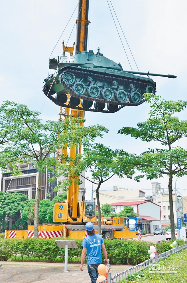 昨(6)日下午,工作人員動用2部吊車,才將這輛從龍潭運動公園運來的M41擺放就位,不但讓戰車難得出現臺北市區和自由廣場,還上演少見的坦克吊掛秀。